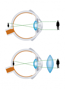 Hierbei handelt es sich um ein zu kurzes Auge im Verhältnis zu seiner Brechkraft. Die in das Auge einfallenden Lichtstrahlen vereinigen sich nicht auf der Netzhaut, sondern dahinter, so dass kein scharfes Bild entsteht. Die Weitsichtigkeit wird mit Sammellinsen korrigiert, damit die Lichtstrahlen sich nun auf der Netzhaut vereinigen und ein scharfes Sehen möglich ist. Ein gewisses Maß an Weitsichtigkeit im Kindesalter ist allerdings normal und kann von den Kindern ausgeglichen werden.