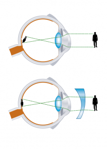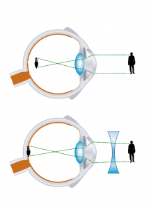 Ein kurzsichtiges Auge ist zu lang im Verhältnis zu seiner Brechkraft. Die in das Auge einfallenden Lichtstrahlen vereinigen sich vor der Netzhaut. Die Kurzsichtigkeit wird mit Zerstreuungslinsen korrigiert, damit wiederum eine scharfe Abbildung auf der Netzhaut erfolgt. Kurzsichtige sehen in der Ferne unscharf und in der Nähe scharf.