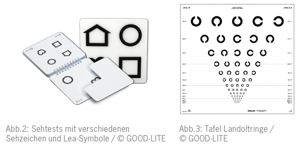 - Sehtest (Kindergartenalter: LEA-Symbole, Schulalter: E-Haken oder Landoltringe)